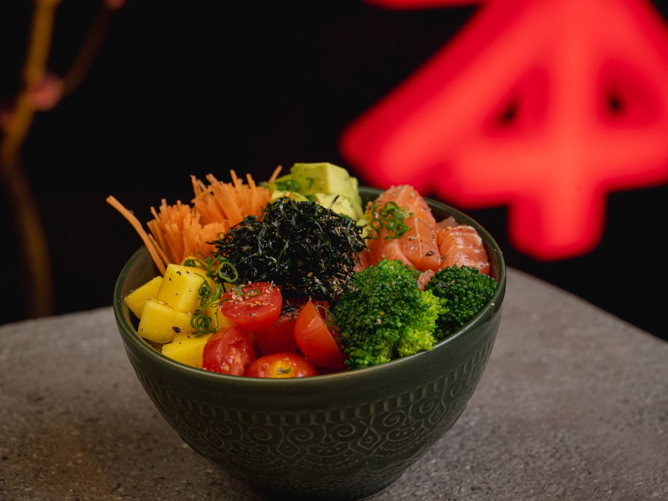 Salmão, shimeji, arroz, cream cheese, brócolis, cenoura, tomate cereja, abacate, manga, sunomono, óleo de gergelim, cebolinha, cebola rocha, gergelim torrado, milho crocante e crispy