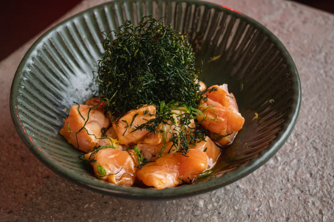 100g de salmão flambado com crispy de couve, tempero da casa e molho de ostra
