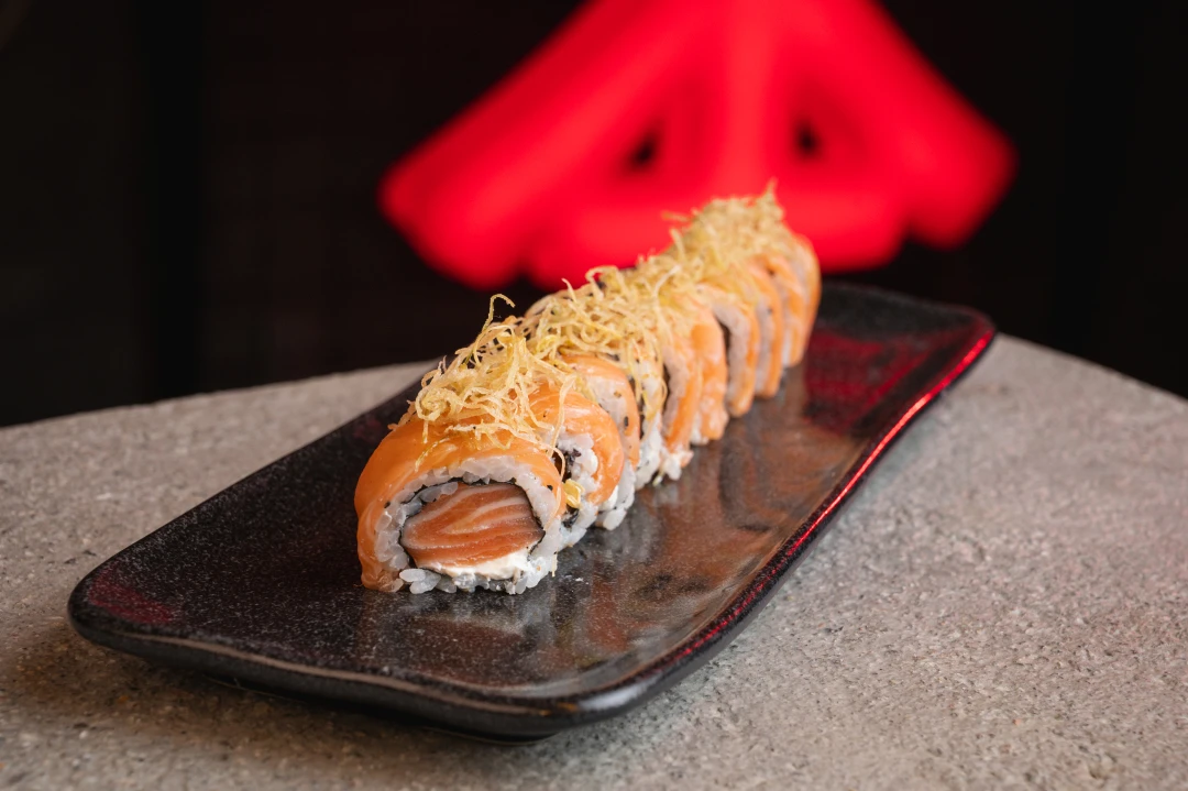 Rolo de arroz por fora e alga por dentro, recheado com salmão e cream cheese. Cobertura com lâmina de salmão e finalizado com crispy.