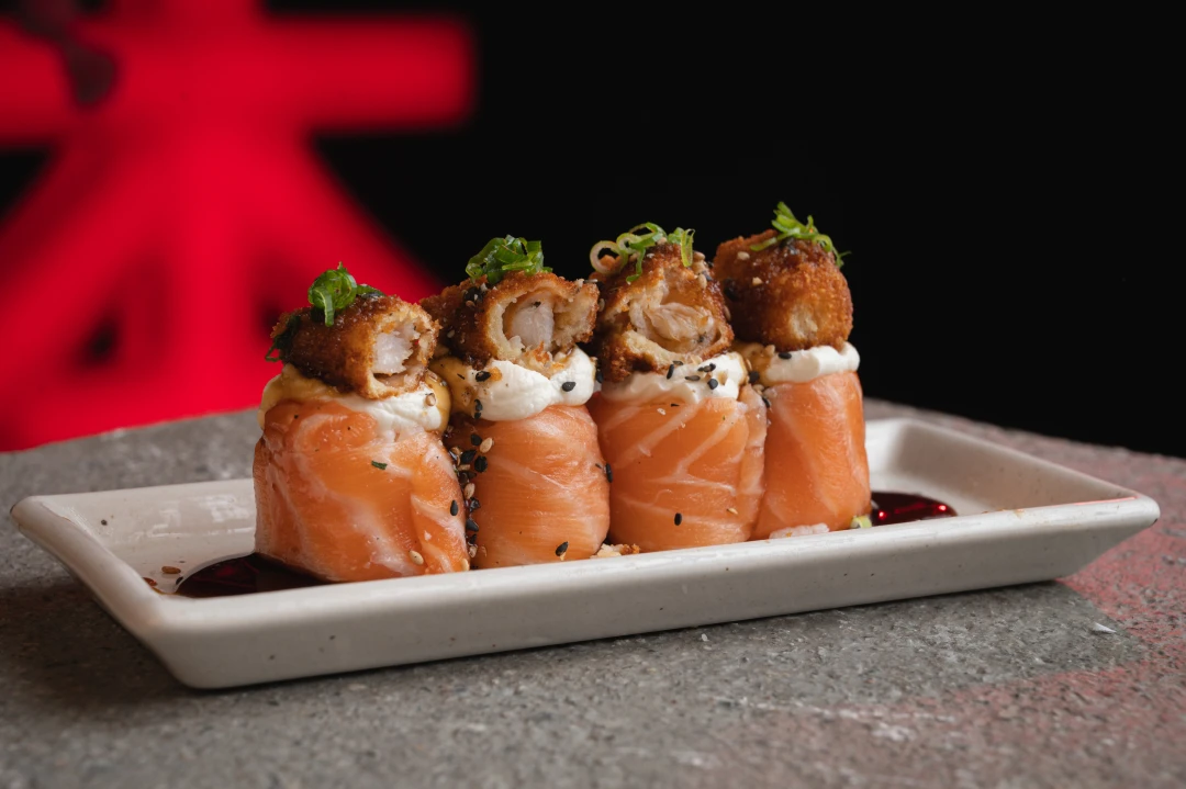 Porção de arroz envolto em salmão flambado com creme de queijo brie, finalizado com sweet chilli.