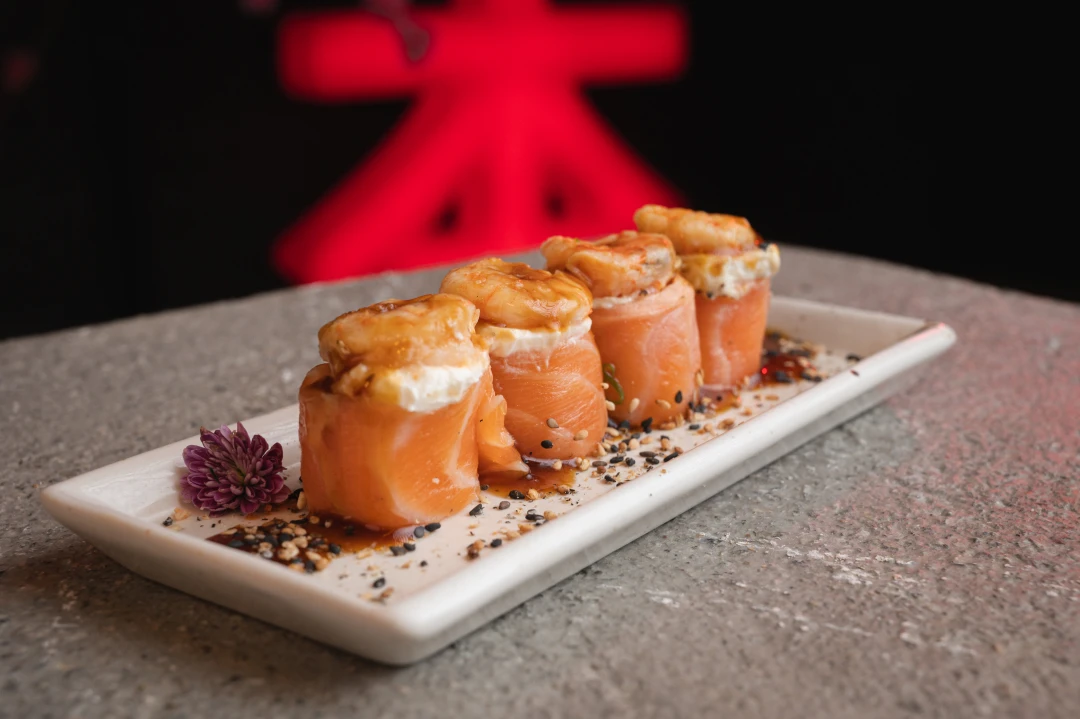 Porção de arroz envolto em salmão flambado com creme de queijo brie, finalizado com sweet chilli.