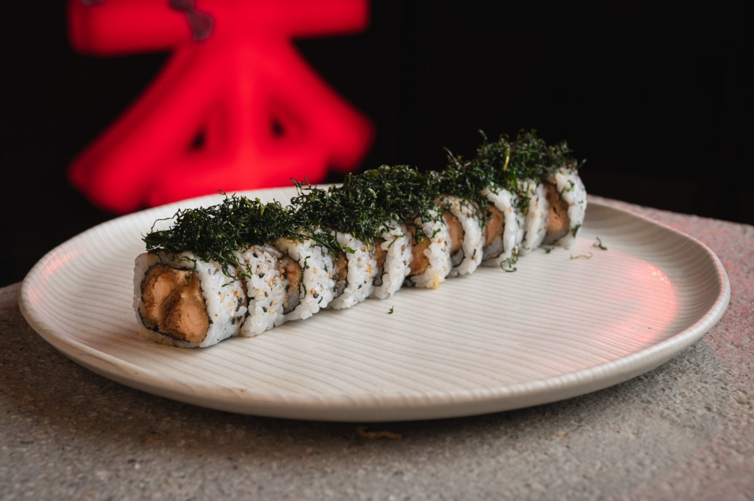 Rolo de arroz por fora e alga por dentro, recheado com patê salmão e cream cheese, finalizado com crispy de batata doce