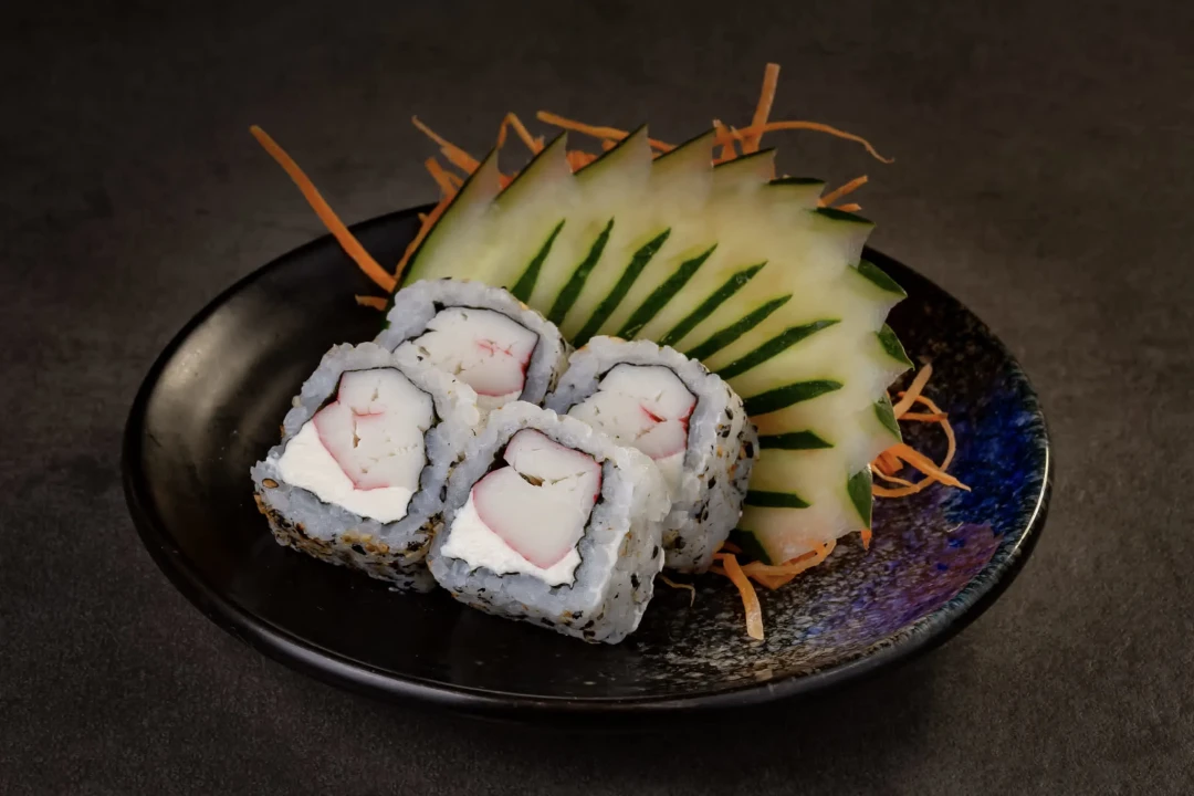 Rolo de arroz por fora e alga por dentro, recheado com camarão empanado e cream cheese. Cobertura com lâmina de salmão e finalizado com crispy.