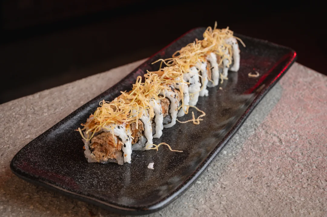 Rolo de arroz por fora e alga por dentro, recheado com patê salmão e cream cheese, finalizado com crispy de batata doce