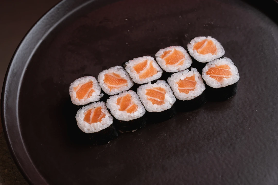 Rolo de arroz com alga por fora, recheado com salmão