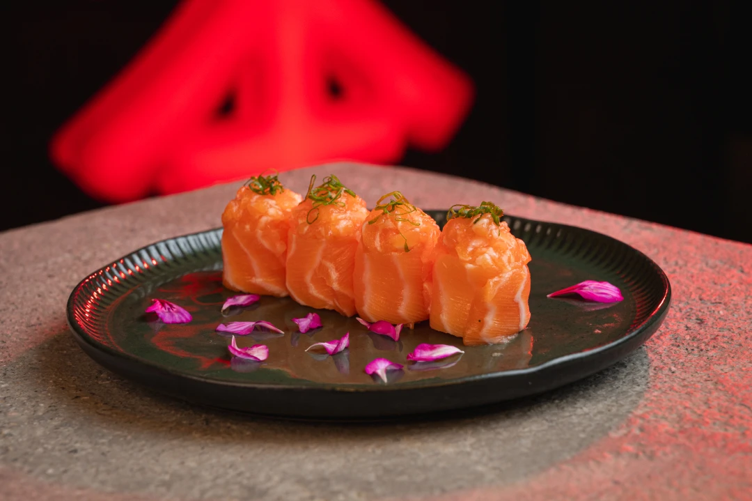 Porção de arroz envolto em salmão flambado, coberto com creme de gemas, cream cheese, azeite trufado e páprica