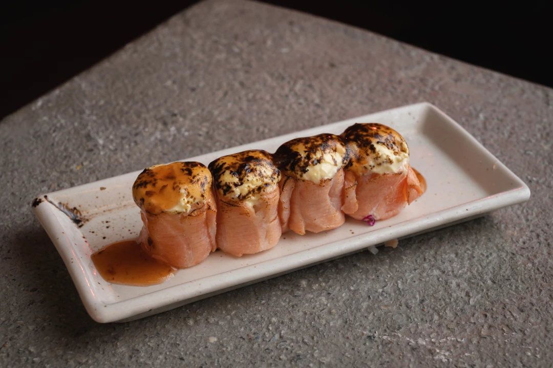 Porção de arroz envolto em salmão flambado com creme de queijo brie, finalizado com sweet chilli.