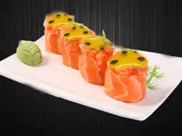 Porção de arroz envolto em lâmina de salmão, finalizado com geleia de maracujá artesanal feita na casa.