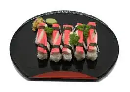 Porção de arroz coberta com lâmina de salmão flambado e finalizado com azeite trufado, flor de sal e raspas de limão siciliano .