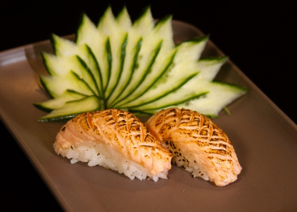 Porção de arroz coberta com lâmina de salmão flambado. Finalizado com molho tarê da casa, gergelim torrado e cebolinha.