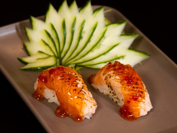 Porção de arroz coberta com lâmina de salmão e finalizada com geleia de pimenta.
