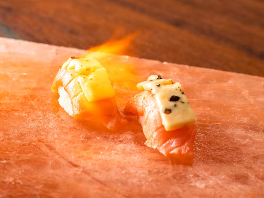 Porção de arroz coberta com lâmina de atum flambado. Finalizado com flor de sal, raspas de limão siciliano e gergelim torrado.