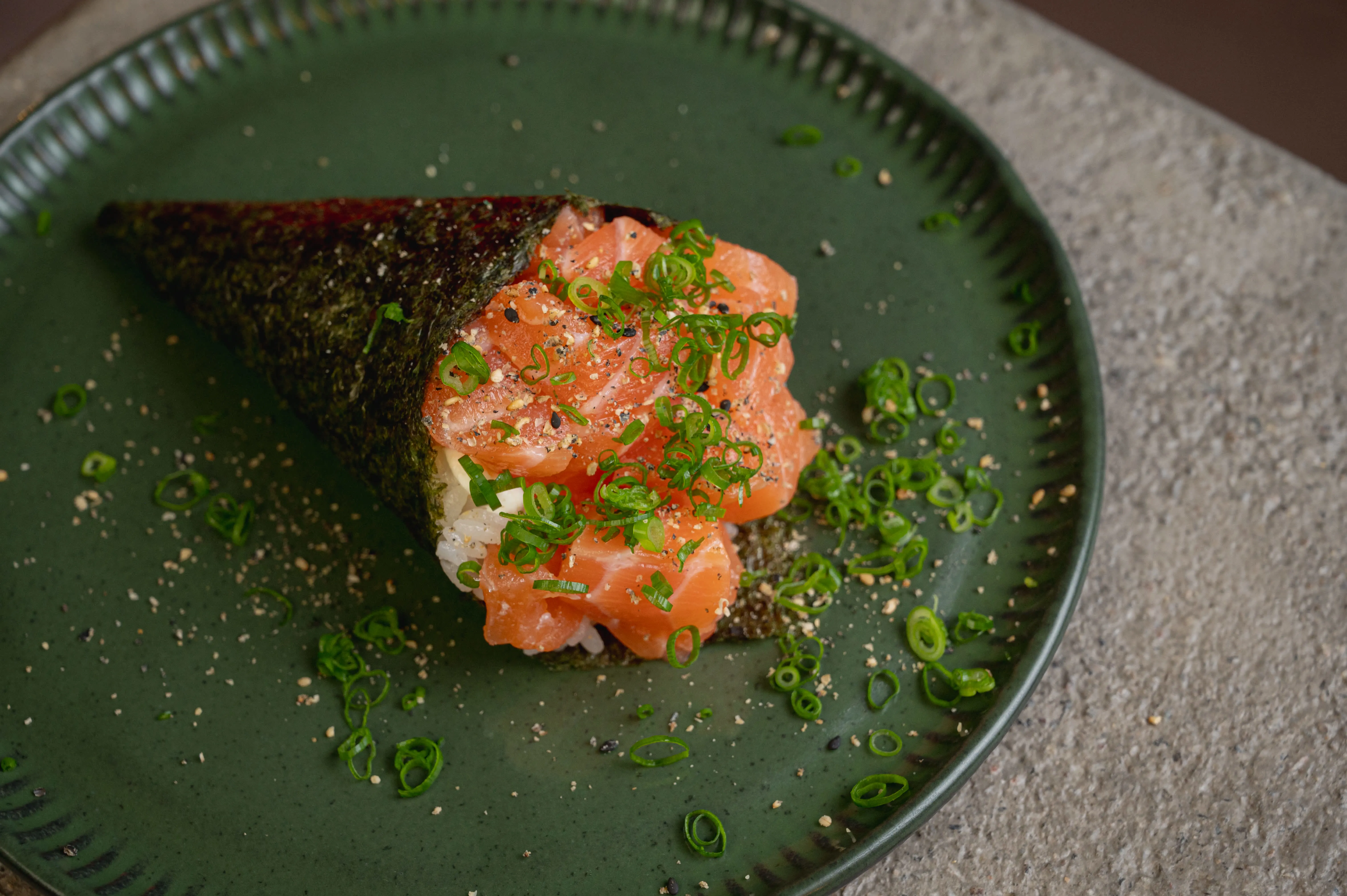 Cone com porção de arroz e alga. Recheio de salmão, cream cheese e cebolinha.