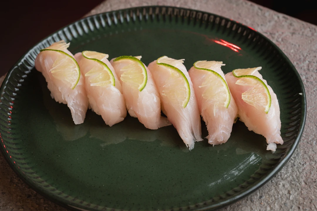 Porção de arroz coberta com lâmina de peixe branco. Finalizado com lâmina de limão