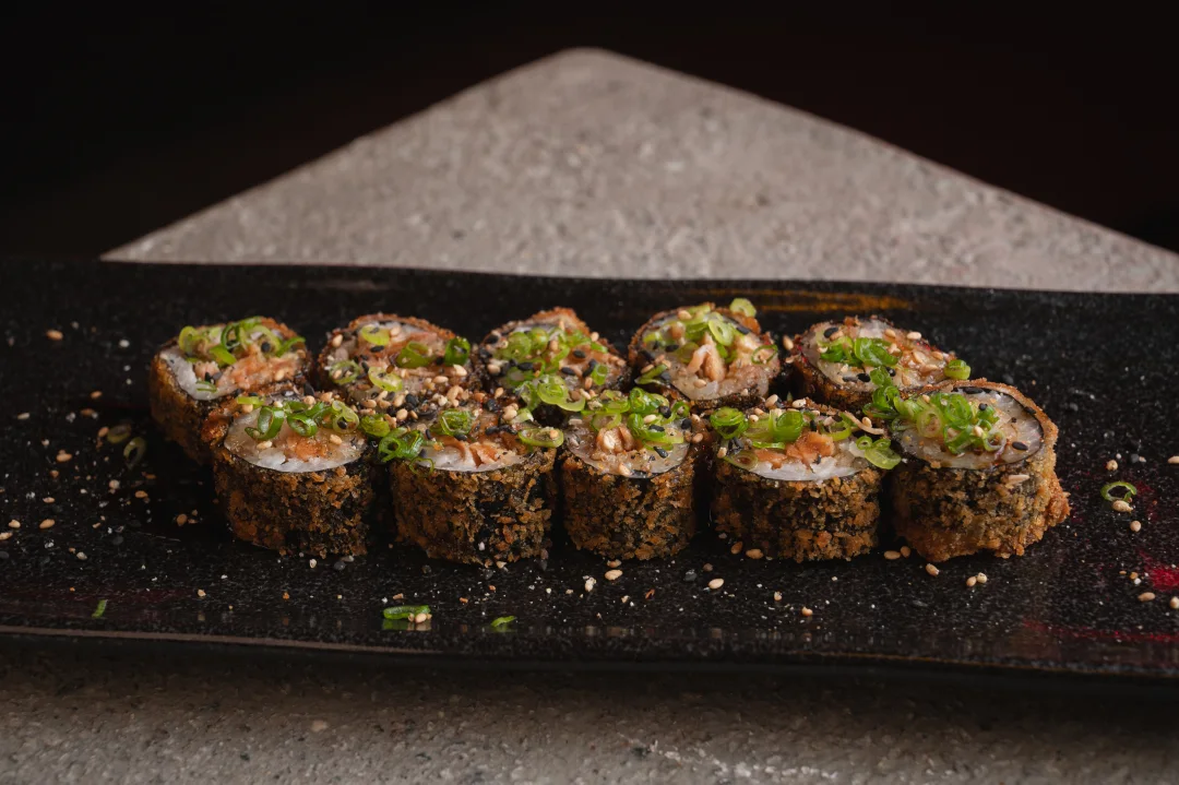 Rolo frito de arroz com alga, empanados com farinha panko. Recheio de salmão, cream cheese e finalizado com molho tarê da casa, crispy de alho poró e cebolinha.