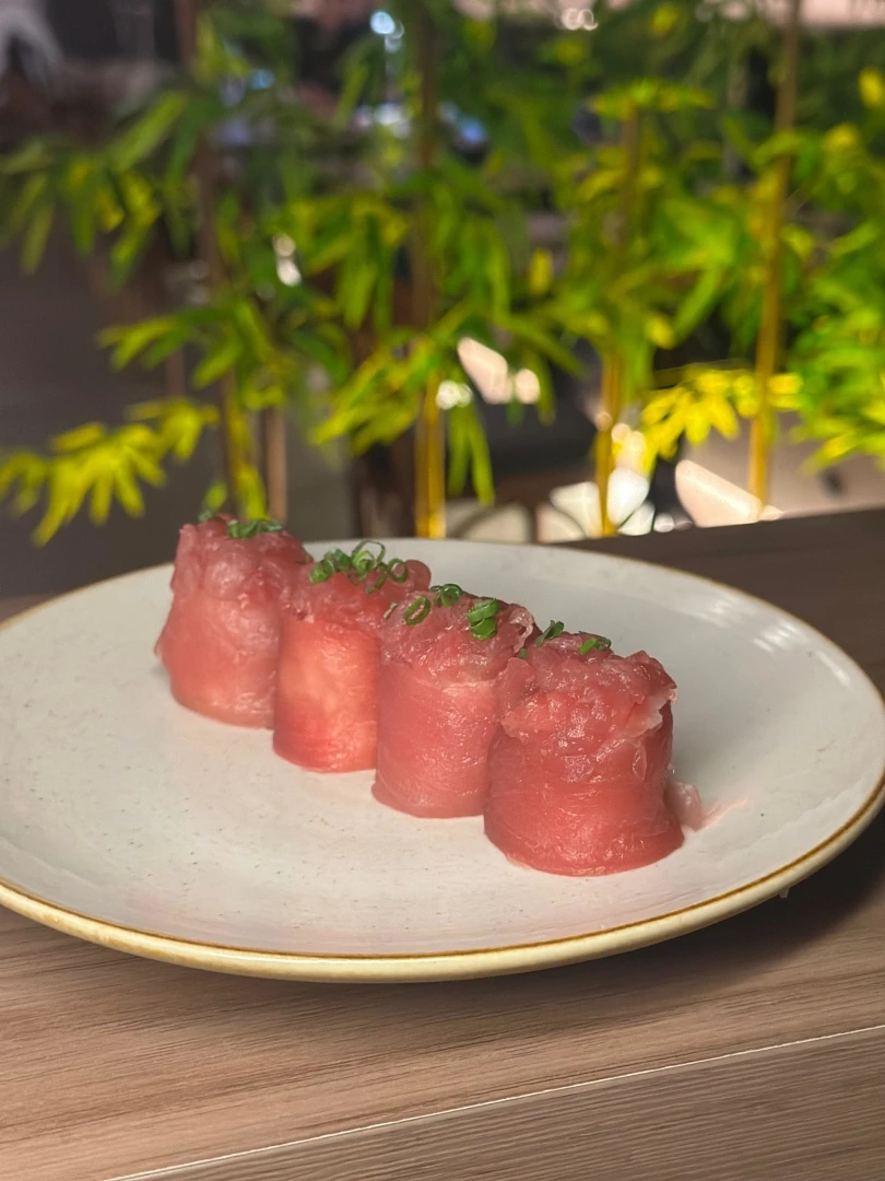 Lâmina de atum envolvendo bolinho de arroz, cobertura com atum e cebolinha