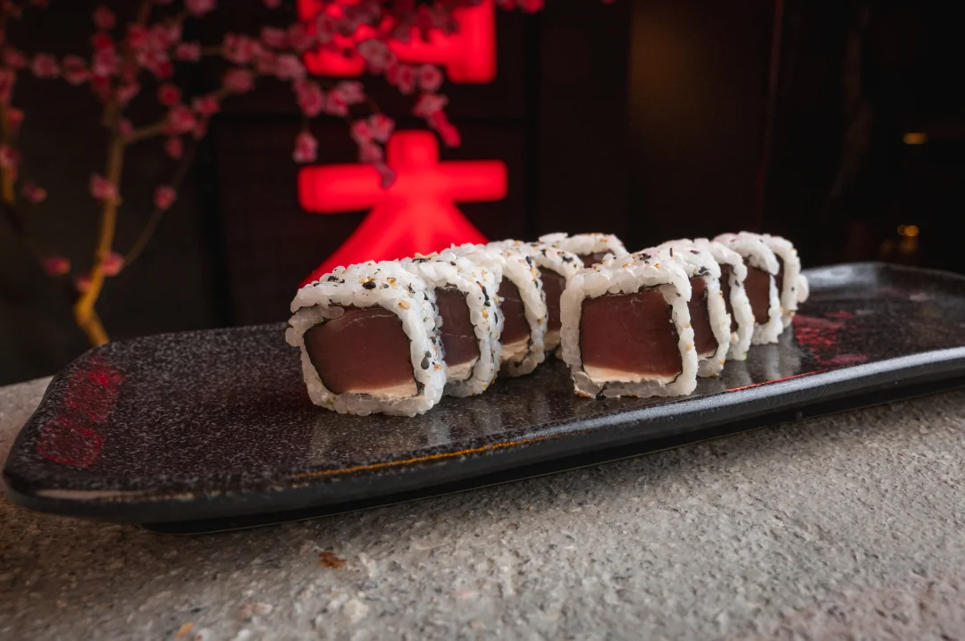 Rolo de arroz por fora e alga por dentro, recheado com atum e cream cheese